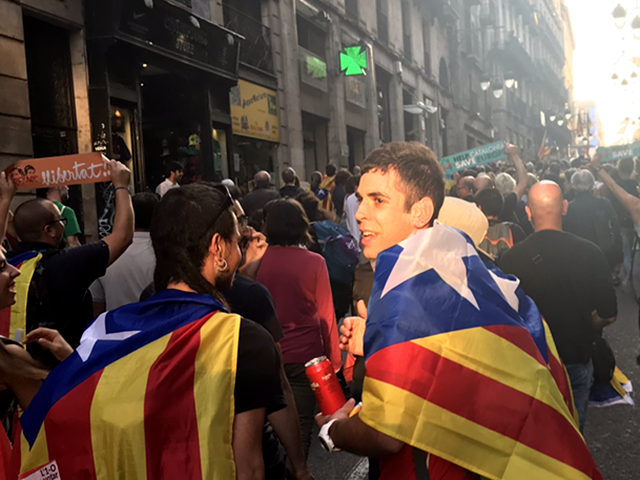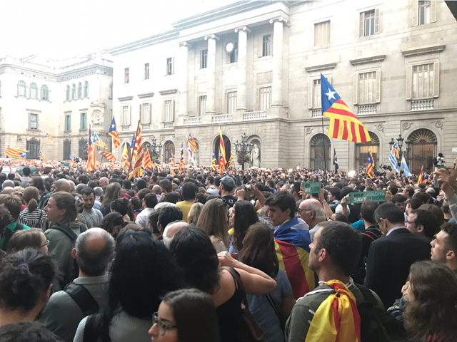 远处临时设立的电子屏正播放着关于加泰罗尼亚独立的最新报道。很快,聚集的人越来越多,或是手举标语、或是身披旗帜,还有人弹奏乐器,不少人一起附和着唱起加泰罗尼亚歌曲,甚至还有小贩在人群中售卖起了啤酒,一派节日的欢庆氛围。受组织者号召,到17:30左右时,已有约1.7万名群众聚集在此,为了一起庆祝当日宣布的“加泰罗尼亚共和国”的独立。