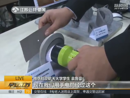 南京航空航天大学学生袁鲁豪:现在有一个手电筒,没有使用龙虾眼仿生结构的话,咱们看到的情况是这样的。现在我们用手电筒经过这个龙虾眼的仿生结构,我们可以看到手电筒的光源被汇聚到了一点。