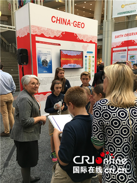 地球观测组织秘书处主任瑞恩女士与参观的美国学生在中国展区交流(摄影:赵新宇)