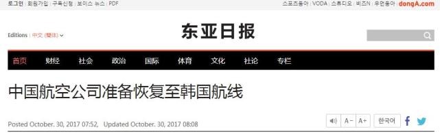 “中国航空公司准备恢复至韩国航线”的消息30日登上了韩国《东亚日报》以及《亚洲经济》等网站的首页。