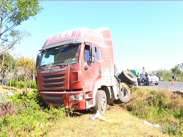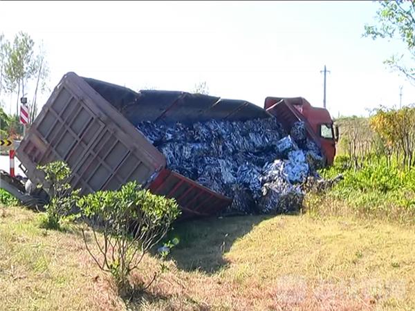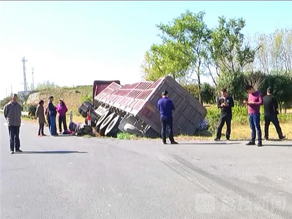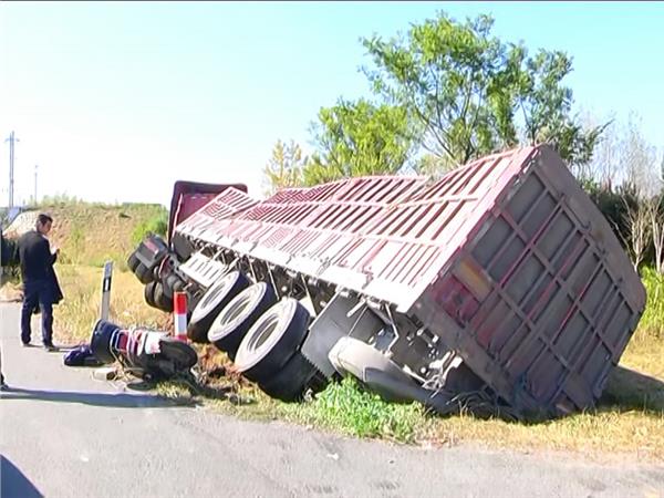 记者赶到现场时,受伤的老人已经被120接走送往医院救治。当地交警已经在路面设置锥桶警示隔离带。在道路的北边一辆大货车侧翻,车轮悬空,车厢尾部倒着一辆电动自行车,已经破碎,路面上散着雨披。大货车车厢里运载着铁皮下脚料,货车侧翻后散落在地面上。
