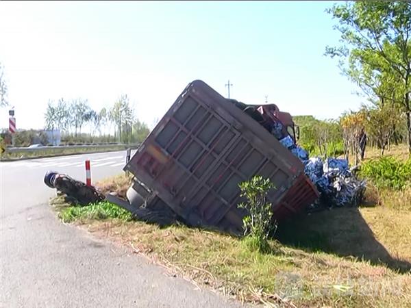 10月30日中午12点多钟,S353省道仪征马集恒华大鲍水库四岔路口发生一起交通事故,一辆满载铁皮下脚料的大货车和过马路的电动自行车相撞,骑电动车老人当场被撞入到道路北边的路坎里动弹不得。