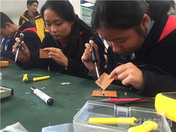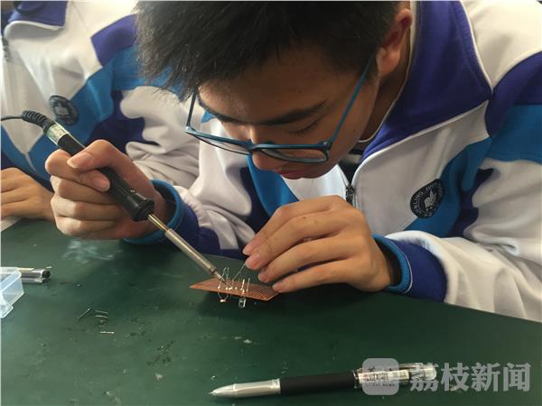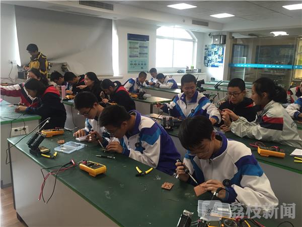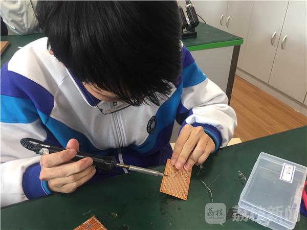 在南京市金陵中学,同学们的综合实践活动课刚刚开始,今天他们要学习的是传感器与电子设计,大伙儿正在两位老师的指导下,进行电路的焊接和制作。
