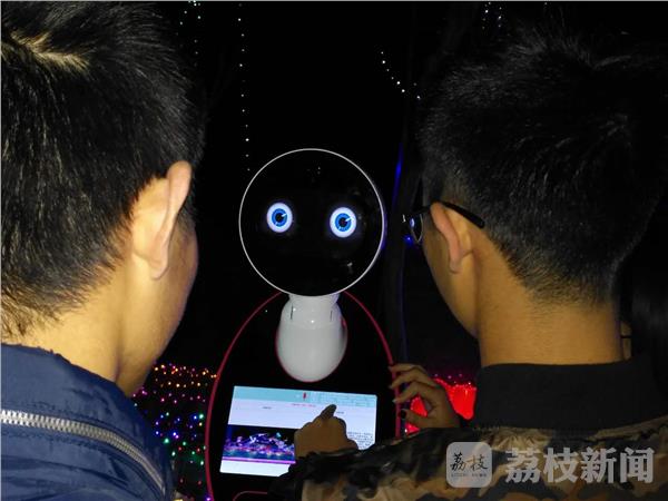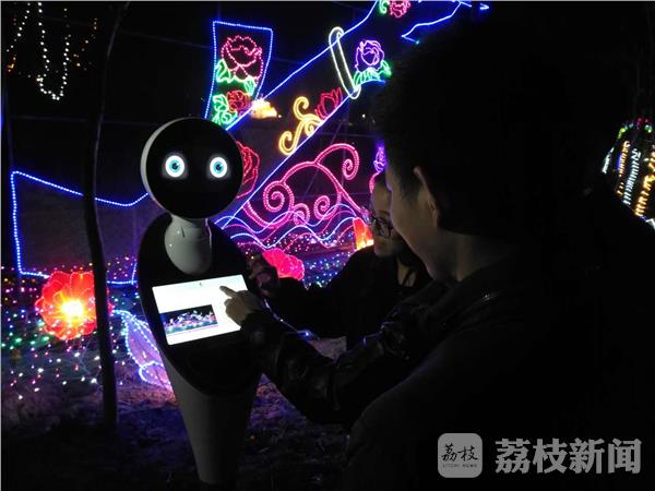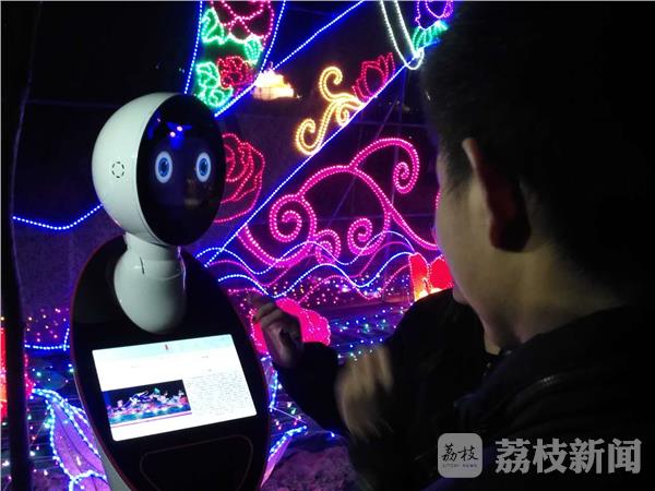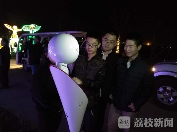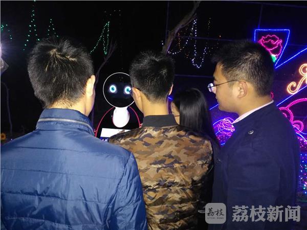 今晚(10月31日晚),荔枝新闻记者来到现场看到,许多南京、及周边句容、镇江的游客前来赏灯。今天气温有所下降,乡村旷野中吹来的风让人感到一些寒意。但明亮的灯在闪烁,人们步行其中,如入梦幻。其乐融融。记者看到,每一组大型灯展前都布置了一个智能机器人,可与游人互动,解答南京、江宁,以及上元灯会的相关知识,让游人赏灯之际学习人文历史,更有收获。