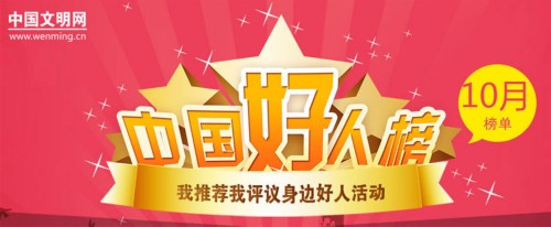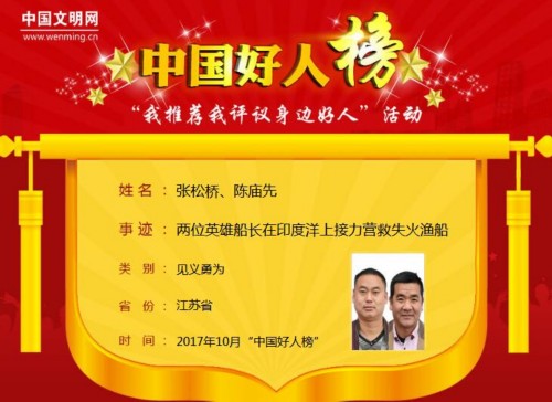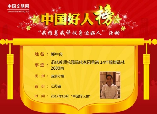 10月31日,中央文明办发布10月“中国好人榜”,101位助人为乐、见义勇为、诚实守信、敬业奉献、孝老爱亲的身边好人光荣上榜。14年植树造林2600亩的南通退休教师郭中良和两位在印度洋上接力营救失火渔船的英雄船长张松桥、陈庙先,荣登10月“中国好人榜”。