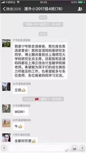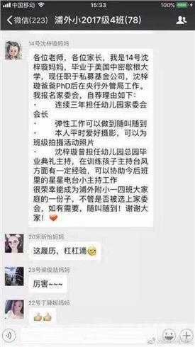 '我是14号的妈妈,毕业于美国密歇根大学,现任职于私募基金公司,爸爸在央行外管局工作','我是17号的爸爸,我和孩子的妈妈是研究生同学,博士期间曾担任上海师范大学研究生会主席'.....这就网上热传的,一个'浦外小2017级4班'微信群里,各位家长竞选家委会的自我介绍,真的是'一山还比一山高'。记者了解到,家委会成员基本上是没有额外报酬的,说白了就是对学校的义务奉献,碰上学校和班级的大事小情,也都要参与策划实施,会占用很多的时间。那么,为何这些家长要挤破头加入家委会呢?