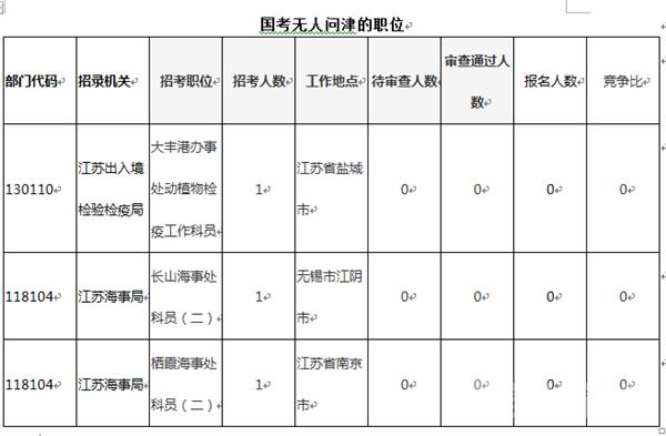 截止到下午4点,无人问津的职位进一步的减少,仅仅只剩下三席。分别是江苏出入境检验检疫局大丰港办事处动植物检疫工作科员、江苏海事局长山海事处科员(二)、江苏海事局栖霞海事处科员(二)。