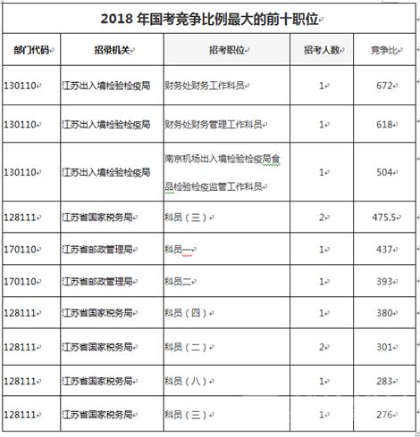 而竞争比例屈居第二和第三的职位,也都是江苏出入境检验检疫局,分别是财务处财务管理工作科员和南京机场出入境检验检疫局食品检验检疫监管工作科员,竞争比例为618:1与504:1。而在竞争比例排除前十中有3席是江苏出入境检验检疫局,7席为江苏省国家税务局,可见出入境检验检疫局与国家税务局是收广大考生最青睐的2个部门。