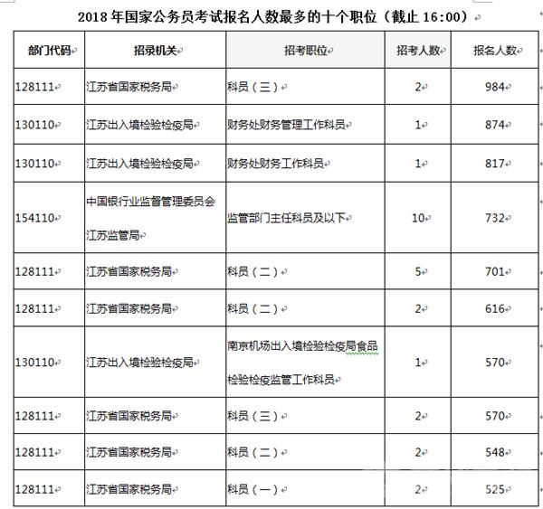 通过数据对比可以看出,报名人数最多的职位为江苏省国家税务局科员一职,独占鳌头,报名人数突破900,招录2人,报名人数984人,通过审核人数951人。而江苏省国家税务局报名总人数已达34388人,占国考总人数的64%与前几年一样,国税又是今年的大热门。