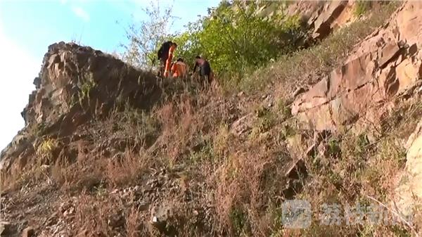 由于此处山势较为陡峭,且有很多碎石,一不小心就容易滑倒,为了防止对男子造成二次伤害,救援人员给被困男子带上了救援头盔,并用衣物包住了男子受伤的部位,用安全绳将担架与山腰上的树木绑住,由两名救援人员拉住绳子,以防止由于不慎摔倒而导致的担架滑落,随后救援人员交替抬担架和固定碎石,一点点的向山下移动。