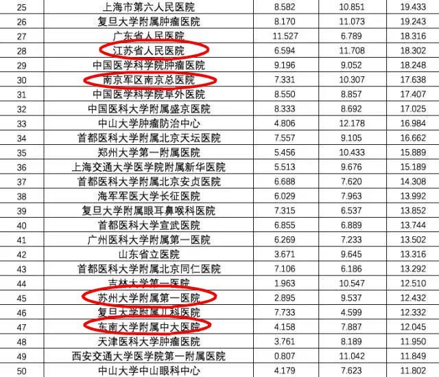 此次百强综合榜,前100名江苏5家医院上榜,分别是江苏省人民医院、解放军南京军区总医院、苏大附一院、中大医院、鼓楼医院。前50名4家,分别是省人医、军总、苏大附一院、中大医院。