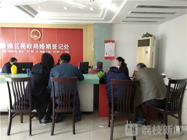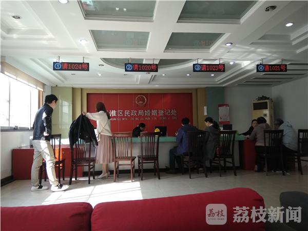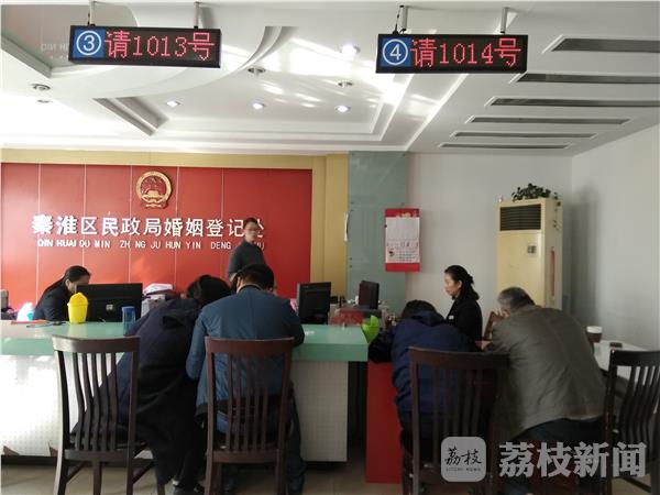 早上八点半左右,秦淮区民政局婚姻登记处门口就有不少人在等候了,九点钟一上班开始,工作人员就一直忙碌起来。不少人表示,选择这一天来领结婚证,是个好日子:王笑阳说,已经计划了有半年了,因为这是“脱单”的日子,双十一刚刚好脱单,我觉得非常开心,感觉蛮幸福的。