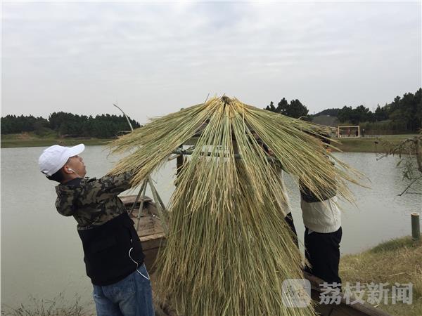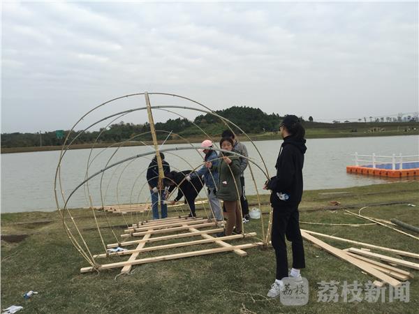 比赛分为初赛和实地营建两个阶段。初赛阶段共收到近70组创意设计方案,最终《归雁》《渔舟唱晚》《老人与海》等26组作品进入实地营建。在现场记者看到,学生们分为六人一组,女生们负责稻草的编织,男生们负责作品结构的搭建。陆雨珂和董达源所在小组设计的作品是《渔舟唱晚》,表达的是一个身披蓑衣的老人,站在船头撒网捕鱼的景象。