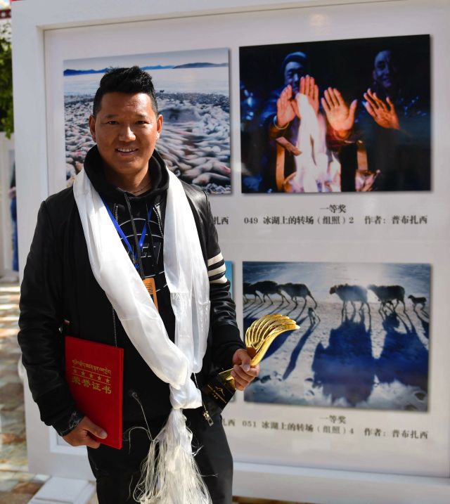 普布扎西在获奖作品前。他凭借摄影作品《冰湖上的转场》获得大赛唯一一个一等奖。(11月11日摄) 新华社记者 晋美多吉 摄