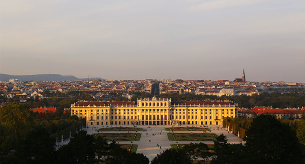 跟略显压抑的城中城“霍夫堡宫”相比,来维也纳的旅行者更青睐郊外的美泉宫,实际上哈布斯堡家族的成员们也愿意住在后者,很多时候美泉宫成了帝国的权力中心,就像圆明园。这座共有1441个房间的宫殿,树木修剪齐整的巨大的几何形花园,点缀着神话人物雕塑的喷泉,处处洋溢着法式园林的意趣,仿佛巴黎凡尔赛宫的缩小版。事实也的确如此,十七世纪“太阳王”建成的凡尔赛,很快成为欧洲各国建立皇家园林的样板,圣彼得堡的夏宫、波茨坦的无忧宫、巴伐利亚的赫尔伦基姆泽宫都是凡尔赛的复制品,美泉宫整体设计也不例外,但有自己的亮点,比如花园尽头的山坡顶上建有一座凯旋门,从宫殿二楼的窗户望过去,成为视线尽头精妙的锁钥。