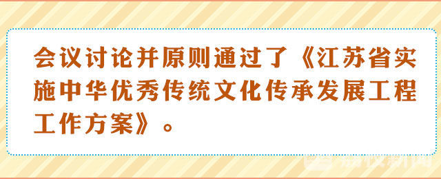 会议强调,要贯彻落实“文化建设迈上新台阶”的要求,系统性地继承和发展我省优秀传统文化,结合江苏文化底蕴,通过实施文化名镇建设、树立一批具有文化自信的文化标识、以师带徒弘扬传承优秀传统文化、积极发展旅游业等举措,以工程的方式加大推动实施力度,进一步彰显江苏文化特色。