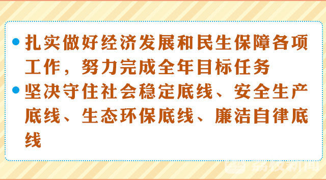会议指出,发展成绩来之不易,要倍加珍惜当前良好的发展态势,扎实做好经济发展和民生保障各项工作,努力完成全年目标任务,保持全面协调可持续发展的良好局面。要做好防风险、化风险各项工作,进一步强化底线思维,坚决守住社会稳定底线、安全生产底线、生态环保底线、廉洁自律底线,确保社会大局和谐稳定。