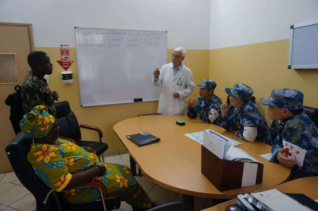 ▲和平方舟医院船消化内科医师施新岗(左)与马普托军事医院专家讨论患者玛利亚·罗莎的治疗方案