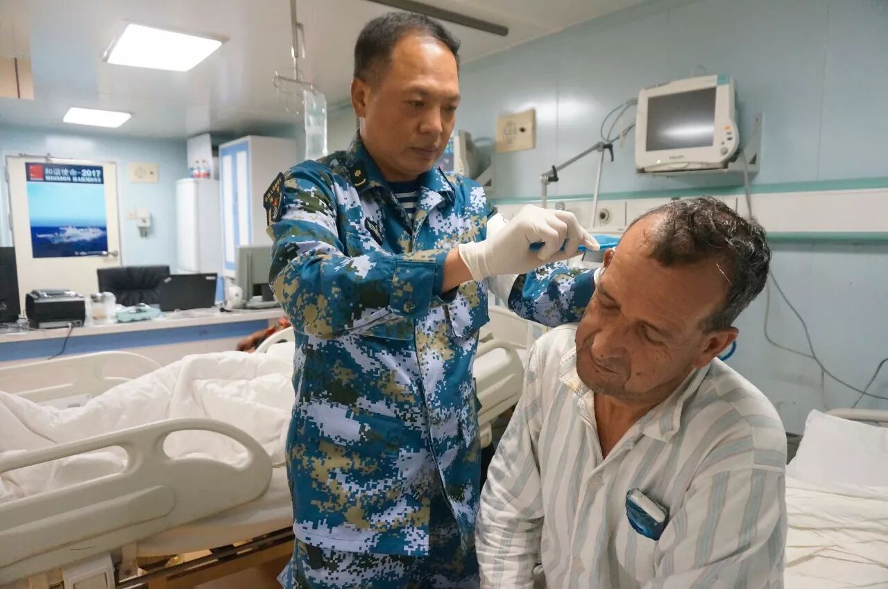 在医院船上经过中国医生的仔细检查,安东尼奥被诊断患有右侧化脓性中耳炎。8日傍晚,耳鼻喉专家林顺涨在麻醉监护下为他实施了鼓膜修补术。
