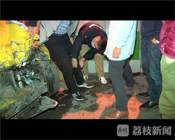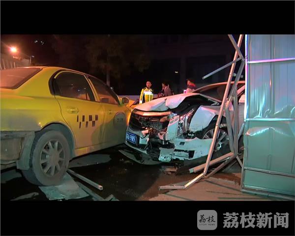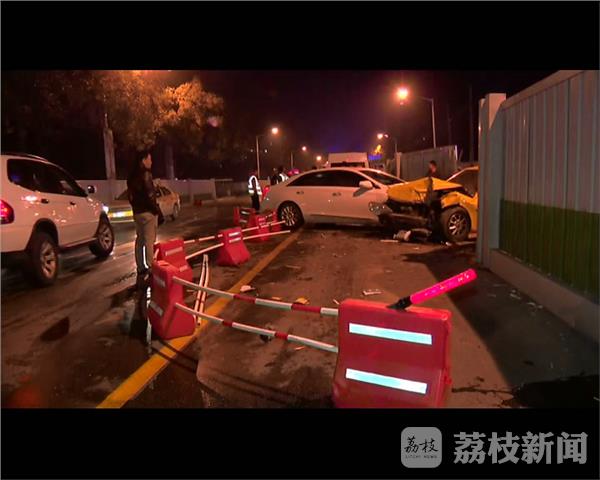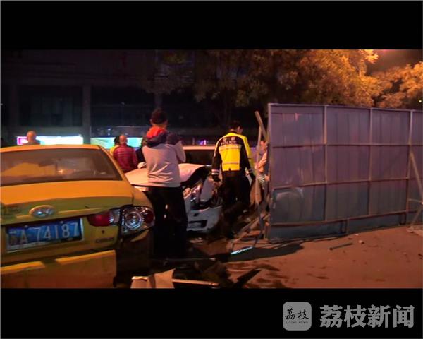11月13日深夜11:40,在南京秦淮区大光路金陵尚府门口,由东向西方向一辆凯迪拉克撞破路中水马围挡,冲向对面车道与一辆出租车迎面相撞,水马撞破20余米,施工围挡撞开,两车车头受损严重,气囊弹出,出租车司机被困驾驶室。