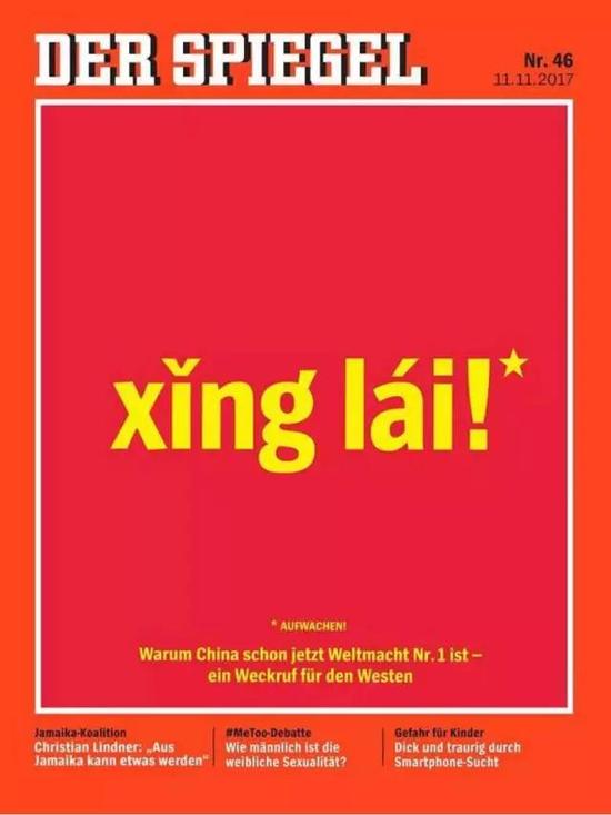 11月11日,德国《明镜周刊》刊载中文汉语拼音“xing lai!”(醒来)作为封面标题,并配以红色的背景衬托黄色字体,视觉冲击力十足。