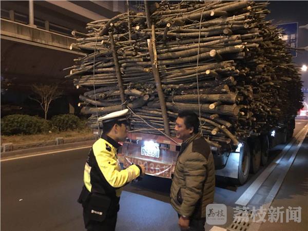 无独有偶,2017年11月14日晚间,一辆大货车上堆放着大量树枝由南向北行驶至范旭东广场下匝口,被正在开展晚间整治的一中队民警鲍万利拦停。检查发现货车上装的是干树枝,只在前半部分进行了简单捆绑,后半部分将整个车遮挡得严严实实,超高、超宽、超长形同“鸟巢”, 这辆半挂车的尾部被树枝遮得严严实实,根本看不到尾灯和反光标识,而后方的车辆稍有不慎,就容易一头追尾上去。