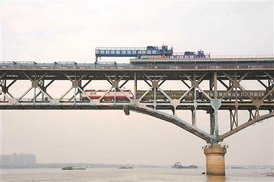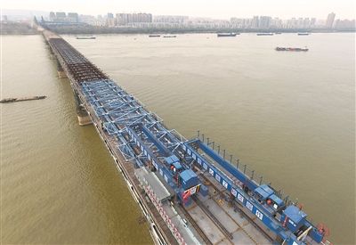 11月19日,两台为南京长江大桥维修定制的钢板铺设机,正在将一块块大型钢板铺设在结构梁上。钢板铺设由南北两端同时进行,已铺设近400米。预计明年下半年铺设完毕后,再加铺道路沥青面层。