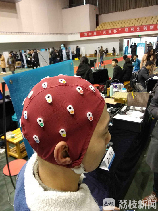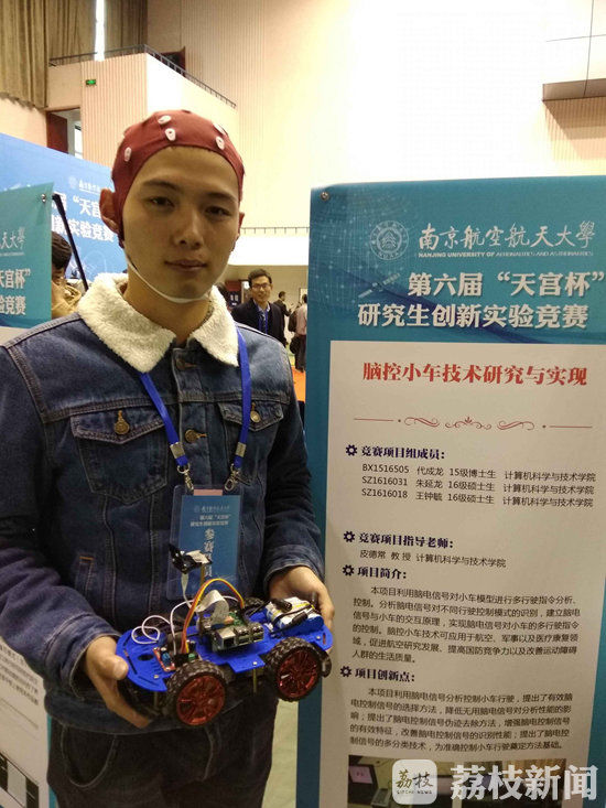 现场的黑科技不止这些,还有利用脑电波控制小车移动的创新项目。戴上一顶特殊的帽子,头脑发出向前走的“意识”,车子就能感应脑电波而向前移动。