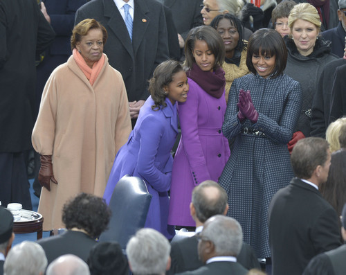 资料图片:2013年1月21日,在美国首都华盛顿,奥巴马的夫人米歇尔(前右)和女儿萨莎(左二)、马莉娅(左三)出席美国总统就职典礼。新华社记者 张军 摄