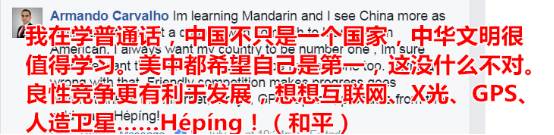 我在学普通话,中国不只是一个国家,中华文明很值得学习。美中都希望自己是第一,这没什么不对。良性竞争更有利于发展,想想互联网、X光、GPS、人造卫星……