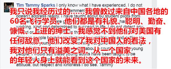 我曾教过来自中国各地的60名飞行学员。他们都是有礼貌、聪明、勤奋、慷慨、上进的绅士。我感觉不到他们对美国有任何敌意。他们改变了我对中国人的看法,我对他们只有溢美之辞。从一个国家的年轻人身上就能看到这个国家的未来。