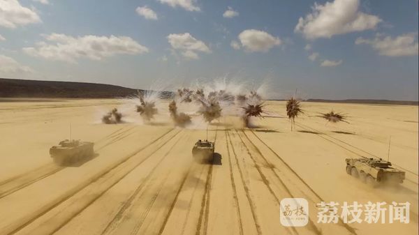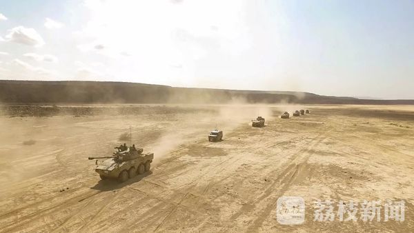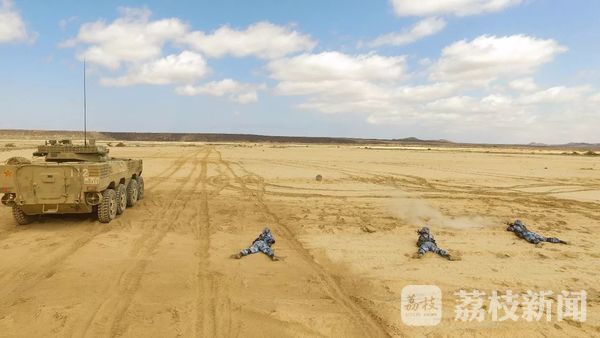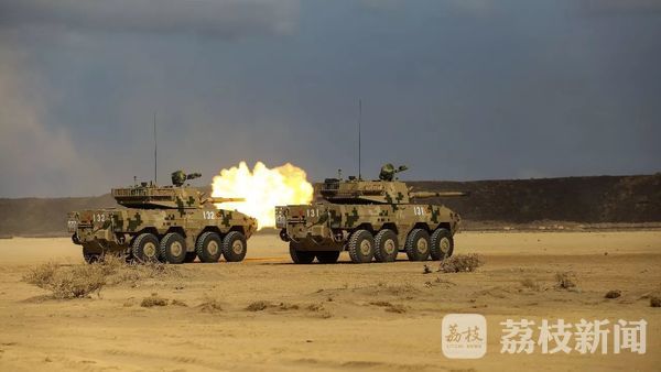 荒漠深处,炮声轰轰。只见数辆轮式突击车和步战车一字排开,随着指挥员一声令下,数十发炮弹精准命中靶标。停止间射击完成后,各型战车又轮番展开运动中射击训练。此外,参训官兵还与战车一起开展协同作战演练,穿插运用自动步枪、班用轻机枪、狙击步枪、车载高射机枪和并列机枪位对目标实施打击。