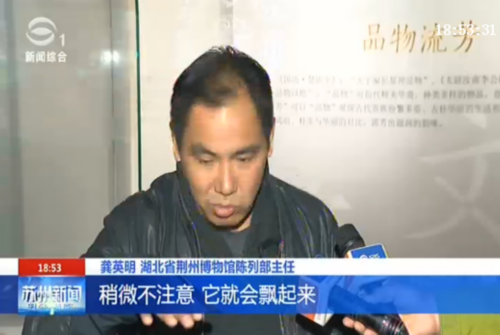 荆州博物馆陈列部主任龚英明介绍,文物的染料用的是朱砂,所以到现在还很鲜艳,非常轻,当时布展的时候,稍微不注意,它就会飘起来。