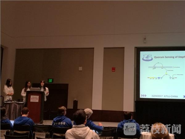 “我们的想法是通过基因改造乳酸乳球菌,使之在金黄色葡萄球菌特有的群体感应系统的影响下,近距离分泌出具有极强杀伤作用的抗菌肽,来杀死金黄色葡萄球菌。” 参赛团队队长、生物科学系学生龚依静介绍说,“此外我们还利用逻辑门对整个生物回路进行有效的调控,这样既能治愈金黄色葡萄球菌感染,又能使益生菌栖居肠道,调节微生态平衡。”