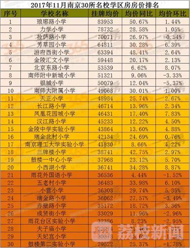 在南京30所名校学区房施教区内,琅琊路小学学区房挂牌均价再度突破8万每平,力学小学、拉萨路小学学区房挂牌均价皆突破7万,芳草园小学、游府西街小学学区房挂牌均价破6万,还有4所小学学区房挂牌均价破5万,分别是金陵汇文小学、北京东路小学、南师附中新城小学和银城小学。