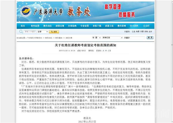 广东海洋大学教务处工作人员:“首先告诉你这个不是新规定,有学生反映说老师在考前划定考试范围,对认真学习的学生当然就不公平了,这个不奇怪啊,反映了这个问题学校再(发通知)强调一下,老师在考试前划定考试范围没有的,而且每个高校相信也不会有(划重点)这种规定,不可能的。”