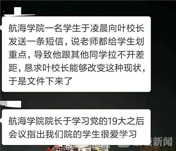 在大学考试前,老师往往会给学生划重点。但是最近有网友爆料称,广东海洋大学航海学院一名学生请求校方,不要给学生划重点,而校方也很配合地发出通知,要杜绝老师考前划重点的现象。