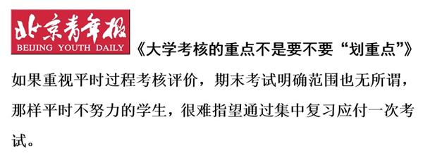现在绝大多数高校还是老师自己教、自己考,而学校的评价体系是双向的,老师要考学生,学生也要给老师打分,许多老师为了不得罪学生而划重点,或将试卷出得很容易,最后大家都是八九十分,似乎双方皆大欢喜。广东海洋大学的一纸通知,没有切实的保障措施,能否改变部分学生平时混日子、考前抱佛脚的现状,让人怀疑。现在部分大学试行“教考分离”,能否有效提高学生学习积极性,也需要持续观察。