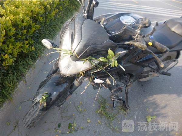 11月16日下午2点多,张某驾驶一辆摩托车沿扬中大道由南向北行驶,这时,一辆电动车在前方路口的人行道上由东向西过马路,张某原想从电动车车头绕行,结果车速太亏,两人在路中央相撞,被撞的电动车倒在了道路中央,而摩托车被撞后方向偏离,冲到了路边的绿化带摔倒。