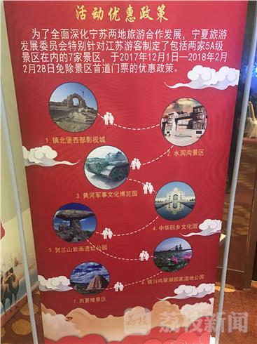 本次推介会的主题是“冬游宁夏·享受阳光”,会上,宁夏旅游界推介了丰富的冬季旅游产品和线路,并向江苏游客送出了大礼包。也就是说,今年12月1日到明年2月底,宁夏的七大景区将对江苏游客免去首道门票,包括镇北堡西部影视城、水洞沟景区、黄河军事文化博览园、贺兰山岩画遗址公园、西夏陵景区、中华回乡文化园、银川鸣翠湖国家湿地公园,江苏游客凭身份证即可享受优惠。