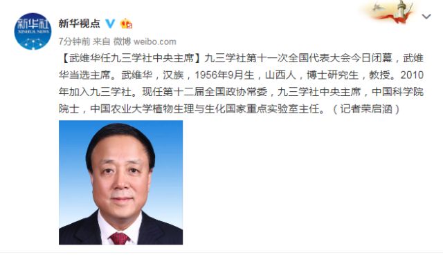 【武维华任九三学社中央主席】九三学社第十一次全国代表大会今日闭幕,武维华当选主席。武维华,汉族,1956年9月生,山西人,博士研究生,教授。2010年加入九三学社。现任第十二届全国政协常委,九三学社中央主席,中国科学院院士,中国农业大学植物生理与生化国家重点实验室主任。