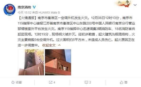 12月08日12时13分,南京市119指挥中心接报江苏省南京市秦淮区中山东路200号中国人民银行南京分行营业部裙楼室外平台发生火灾。南京119指挥中心迅速调集3辆消防车、18名消防官兵赶赴现场。12时19分,现场明火被扑灭。经初步勘查,起火建筑为钢混结构,火灾主要烧毁5台空调外机。过火面积约5平方米,未造成人员伤亡。起火原因正在进一步调查中。