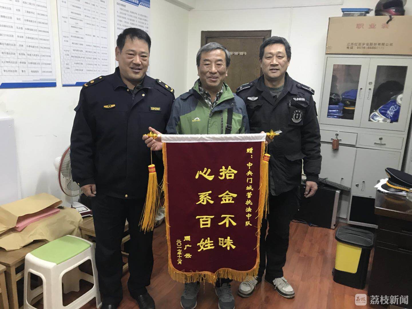 今天,记者在南京鼓楼区中央门街道城管中队,见到了周先生。他带着锦旗,来感谢他身边的这位协管员王师傅。昨天上午8点多钟,王师傅正在新门口路巡查。恰好周先生骑电动车经过这里,不慎将钱包遗失。钱包内有数张银行卡和大量现金。