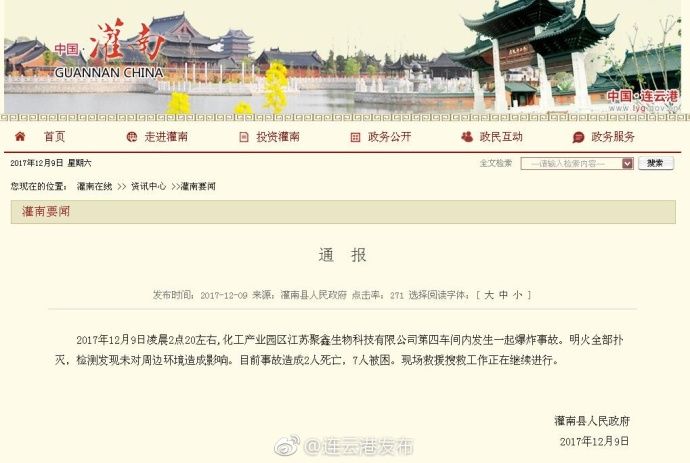 9日下午,灌南县政府官方通报称,事故导致2人送医救治无效死亡,7人被困于倒塌的车间厂房内。消防及公安正在现场继续开展救援。当地环保部门表示,爆炸未对周边环境造成影响。