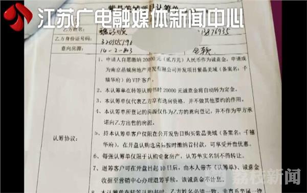 南京晶城房地产开发有限公司 管经理:“任何公司的流程,都不可能或者很少有当天把钱退出来,首先我们项目部,我本人要审核,我们财务要符合审核,包括我们集团总经理也要审核。所以这位客户情绪比较激动,我呢本人给他承诺,最迟于下周五之前,认筹金一定能到位。”