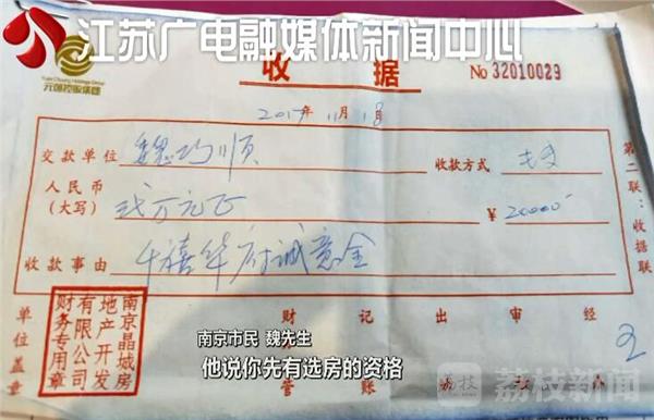 魏先生当初看中的是位于南京市高淳区的紫金美域楼盘。11月18日,在销售人员的要求下,他缴纳了两万元的诚意金。