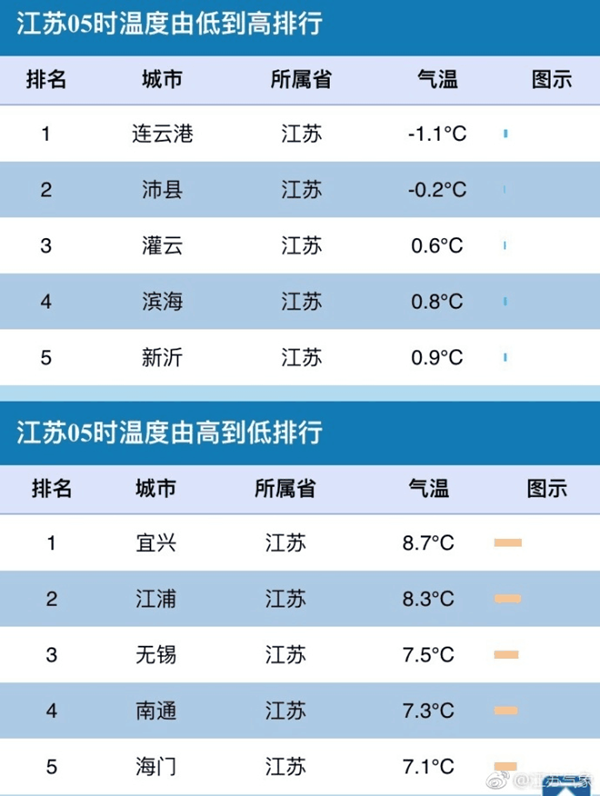 江苏气象说,12月9日多地气温就再次刷新下半年新低,尤其是沿江苏南地区。比如,南京市区只有-2.3℃,浦口低至-3℃。而无锡的宜兴甚至只有-5℃左右,也是全省最冷的地方。10日,气温进一步回升。最低气温全部回到零上,在2到4℃左右,最高气温也有上涨,沿江苏南地区11到12℃,其他地区9℃左右。