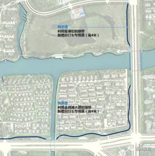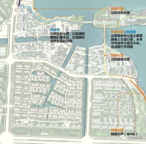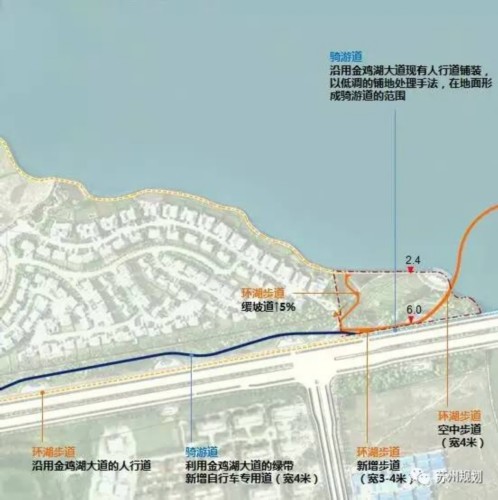 此前,金鸡湖沿岸慢行道和骑车道基本并在一处。但是,考虑到多种人群及功能目的的使用需求及特性,以及水岸空间的活动功能及水岸空间与其他空间及步道系统之间的联系,今后慢行道和骑车道将被区分开来,形成内环步行道和外环骑游道两种步道体系。