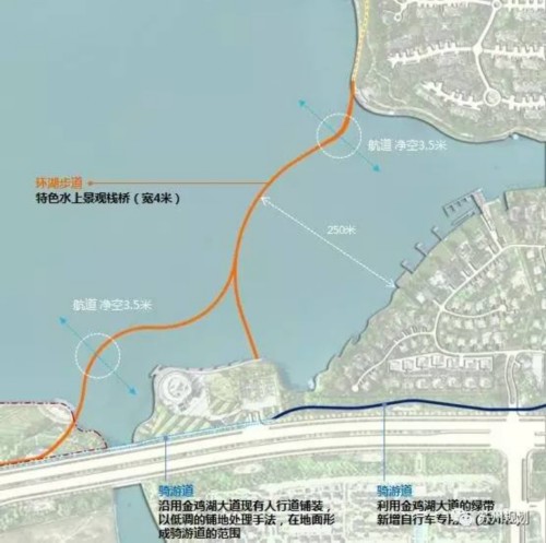 在已建成环金鸡湖公共空间中,改造与提升现有设施,寻找潜力空间打造新的景观节点,在水岸边建立一个包括路径、节点及配套设施的多功能慢行绿道系统。