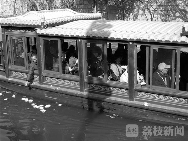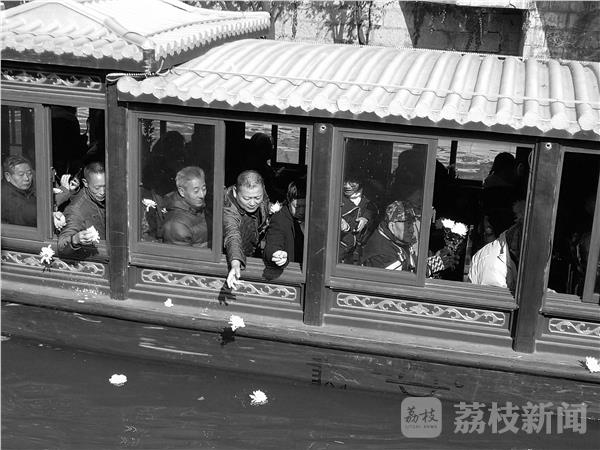 游船开启后,大家向河中洒了朵朵白色的菊花,以示对八十年前那场浩劫里被屠杀的南京市民的哀思。